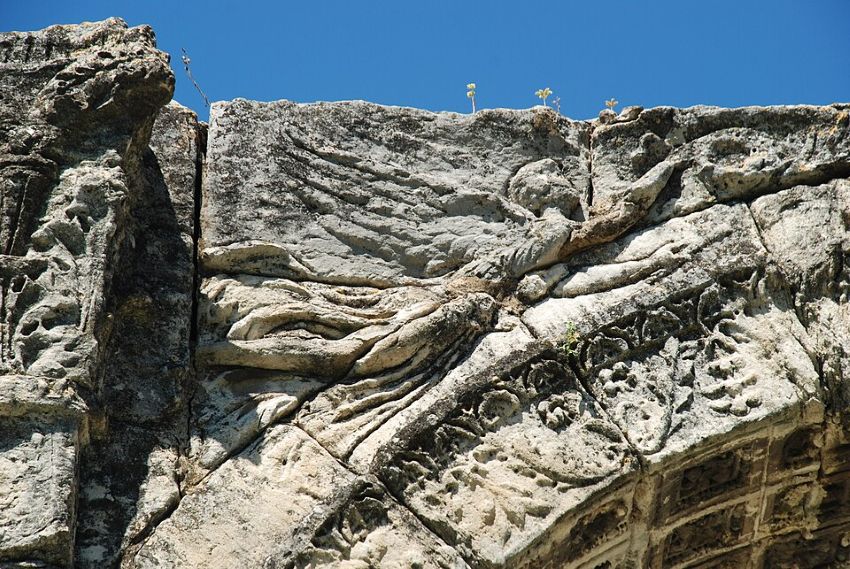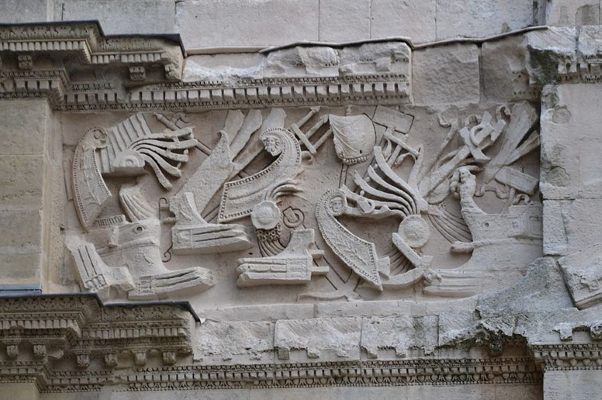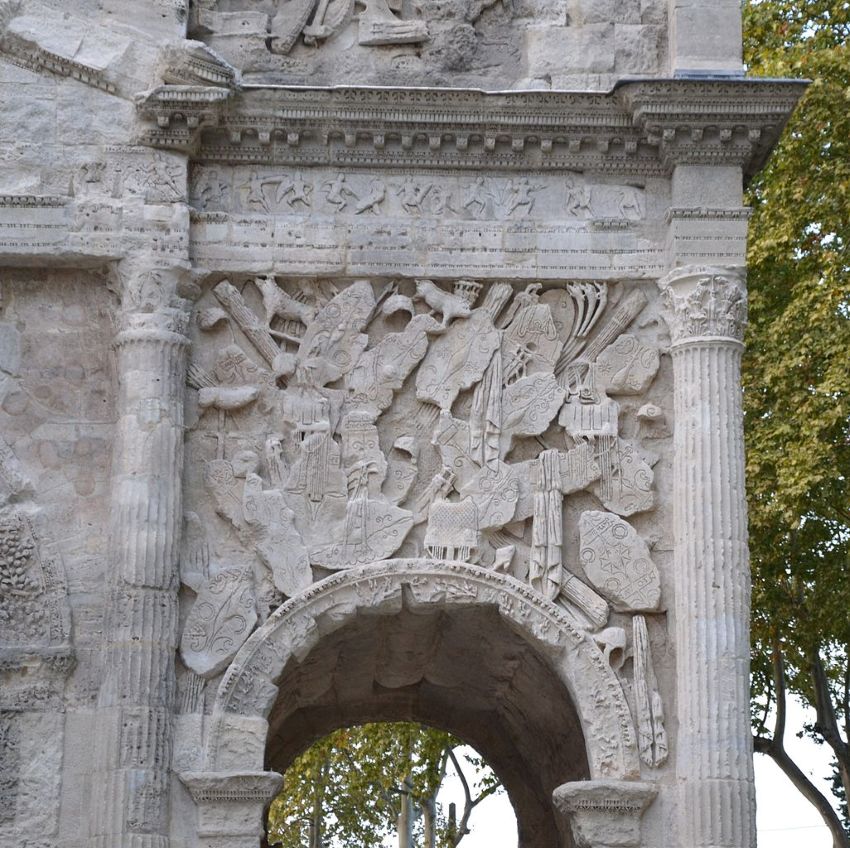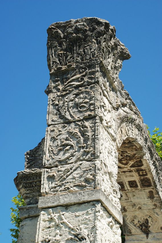 Son ornament fach de garlandas vegetalas, de fuelhas d’acants e de pichòtei divessas aludas es luench de la propaganda augusteana que vesèm a Sant Romieg, Aurenja e Capentràs. La discreta corona tenguda per la divessa de la Victòria es soleta de posquer remembrar aquela dei Triomfes.