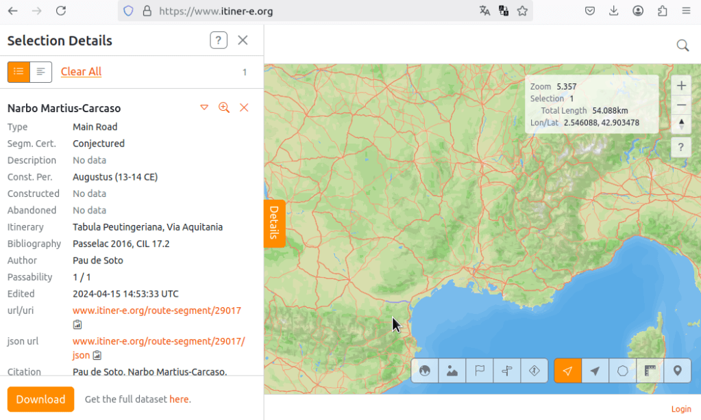 Resultat d’una collaboracion entre cercaires de l’Universitat d’Aarhus (Danamarca), de l’ICAC (Espanha), dau CNRS (França), de l’Universitat de Leiden (Païses Basses) ai costats d’autrei partenaris europèus, la plataforma itiner-e mete en linha lo juec de donadas numericas mai detalhat fins ara sus lei rotas terrèstras de l’Empèri Roman au pus aut de son extension, a l’entorn de 150 ApC.